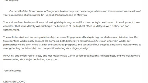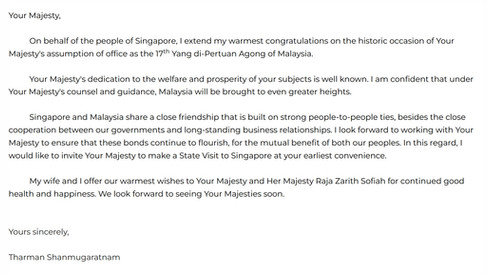 Both PM Lee and President Tharman have sent congratulatory letters, inviting Sultan Ibrahim and his wife to make a state visit to Singapore "at your earliest convenience".